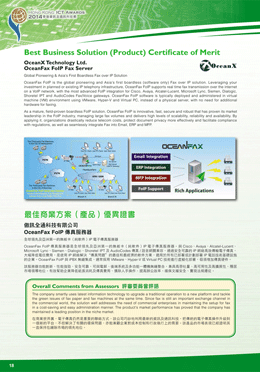 在此次评选中,评审专家针对参选技术产品及解决方案进行了客观评估,对参选企业进行了严格评选。OceanFax FoIP传真服务器凭借其创新功能及广泛应用从众多方案中脱颖而出,夺得殊荣。(点击此处查看获奖证书及最佳商业方案奖获奖方案简介。其中,OceanFax FoIP传真服务器列于方案简介中的第18页。)