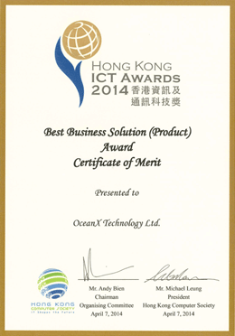 香港资讯及通讯科技奖:最佳商业系统(产品)优异证书